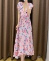Summer Women Flower Print Deep V Neck Lace Up Bow Midi Dress Female Short...